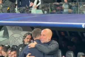 阿隆索赛后主动到教练席拥抱瓜迪奥拉,眼神一直在闪躲