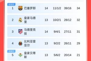 西甲积分榜:巴萨暂升榜首!皇马明晨客战赫罗纳,马竞暂升第3!