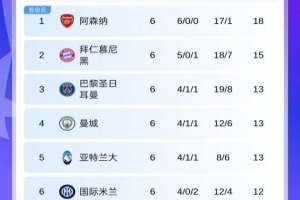 欧冠第6轮积分:枪手全胜基本锁前8!曼城升第4,本菲卡希望重燃