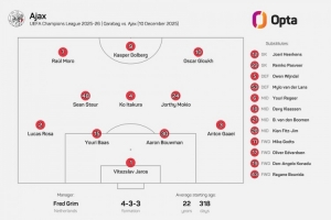 阿贾克斯欧冠首发派出两名17岁球员,队史首次