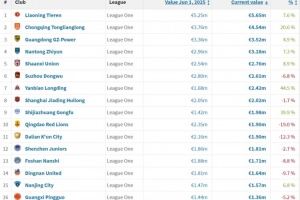 体育资讯6月25日讯 日前,德国转会市场网站统计了更新后的中甲球队身价排行。