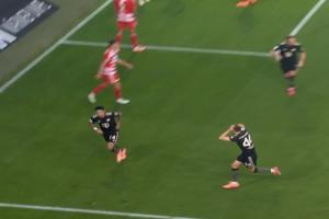 第43分钟,克雷桑左路下底横传门前钟义浩解围打在横梁上,第二点泽卡倒钩打在刘易鑫手上裁判判罚点球,随后经过var提示克雷桑对纳萨里奥犯规在先点球取消。↓