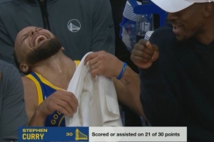 本场巴特勒缺阵,全队首节有21分来自库里得分或助攻。