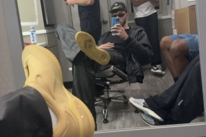 体育资讯9月15日讯 有网友晒出了一张雷霆球员霍姆格伦的对镜自拍图,照片中,霍姆格伦依靠在椅子上翘着腿,拍下了自己的球鞋特写。