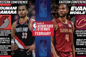 体育资讯3月5日讯 今日NBA官方今日宣布,开拓者队前锋图马尼-卡马拉和骑士中锋小莫布里当选2月份西部和东部最佳防守球员。