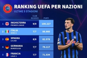 各国联赛欧战积分排名:英超断层居首,意甲、西甲、德甲二到四位