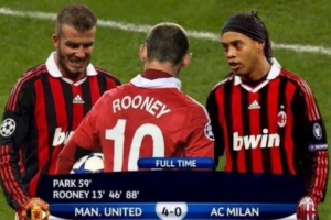 尴尬的是,这张图片是一张P图。2009-10赛季欧冠1/8决赛次回合,曼联确实4-0击败了米兰,但是鲁尼在那场比赛打进2球,另外两球是朴智星和弗莱彻打进,而且米兰那场比赛身穿的是黑色球衣,也不是图片里的红黑间条衫。