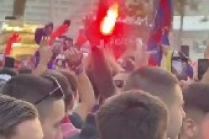 赛前,巴萨球迷在球场外聚集,高喊辱骂巴黎的口号。