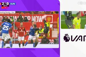 体育资讯10月04日讯 曼联vs桑德兰补时阶段,舍什科抬脚对手倒地!VAR介入!主裁看回放后认定没有点球!