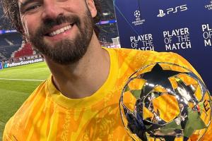 本场比赛阿利森发挥神勇,全场贡献9次扑救,阿利森赛后晒出自己手捧全场最佳球员的自拍照庆祝。