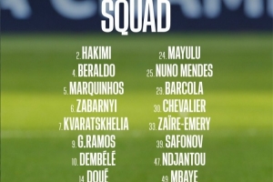 后卫:2-阿什拉夫、4-贝拉尔多、5-马尔基尼奥斯、6-扎巴尔尼、21-卢卡斯-埃尔南德斯、25-努诺-门德斯、51-帕乔