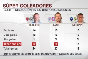 体育资讯10月23日讯 ESPN统计了哈兰德、凯恩、姆巴佩本赛季俱乐部+国家队的数据,并做出对比。