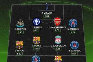 中场:亚马尔(巴萨,8.82分)、费尔明(巴萨,10分)、索博斯洛伊(利物浦,9.28分)、巴尔科拉(巴黎,8.96分)