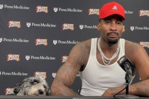 赛后,德拉蒙德带着他的爱犬鲍勃·马利来到比赛现场,这只狗狗和他一起坐在新闻发布台上。
