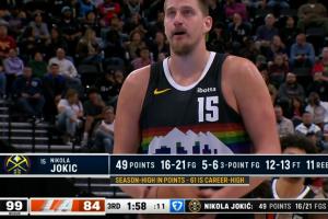 三节结束,约基奇52分11篮板6助攻1抢断1盖帽,22投17中,三分6中5,罚球14罚13中!各节得分分布:25+8+19。