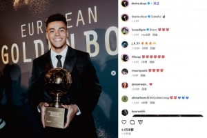 体育资讯12月3日讯 在《都灵体育报》主办的欧洲金童奖颁奖典礼上,杜埃领取了2025年金童奖杯。
