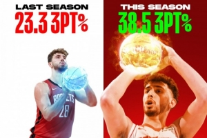 申京本赛季三分命中率38.5%&上赛季23.3%!火媒:进化显而易见