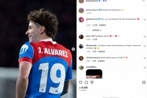 推射空门助马竞险胜!阿尔瓦雷斯社媒晒比赛照:欧冠之夜!