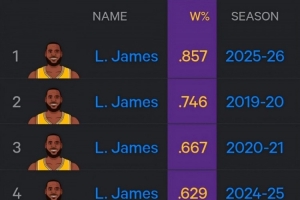 本季詹姆斯出战时胜率85.7% 暂为湖人生涯单赛季新高&超夺冠赛季