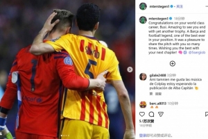 特尔施特根写道:布斯克茨,祝贺你拥有世界级的职业生涯。看到你以又一座奖杯结束职业生涯,真是令人惊叹!你是巴萨和足坛传奇,也是有史以来最出色的中场之一。与你多次并肩作战是我的荣幸,祝你在人生的下一个篇章中一切顺利!