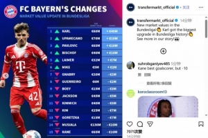 体育资讯12月19日讯 德转公布了拜仁球员的身价变化,其中,小将伦纳特·卡尔的身价上涨了4000万欧元,来到6000万欧元,凯恩和穆西亚拉的身价都下降了1000万欧元。