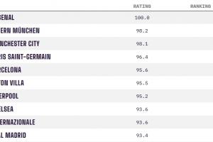 体育资讯12月31日讯 OPTA的球队实力榜单进行了年终更新,目前实力榜单上排名第一的仍是阿森纳。前十名里英超球队占了一半,前二十名里英超球队同样也是占一半。