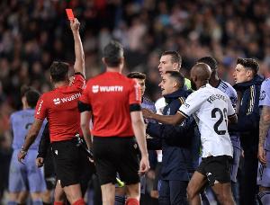 在2024年3月,皇马2-2战平瓦伦西亚最后时刻,贝林厄姆破门,但主裁提前吹响终场哨。皇马集体抗议,贝林厄姆对裁判出言不逊,被主裁判希尔-曼萨诺直红罚下。