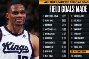 本场比赛过后,威少运动战进球数9615个,超越帕里什升至历史第19位,排在他前面的是尤因的9702次。