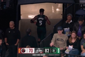 全面压制!贾勒特·阿伦大帽拒绝兰德尔扣篮 反击力压兰德尔暴扣