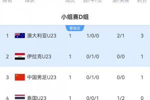 体育资讯01月08日讯 U23亚洲杯小组赛D组首轮,U23国足与伊拉克U23的比赛结束,小组赛首轮所有比赛完场。来看D组积分榜形势。
