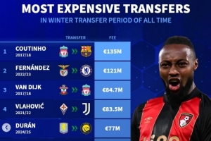 体育资讯1月9日讯 曼城已经官宣签下塞梅尼奥,德转数据统计显示他也是历史第7贵的冬窗引援。