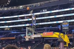 用力过猛!汤姆林跳球奋力一拨 将球打中自家篮筐