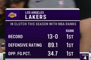 湖人本赛季关键时刻13胜0负,防守效率89.1和限制对手命中率34.7%均为联盟第一!