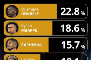 环足奖最佳球员投票:登贝莱反超姆巴佩登顶,拉菲尼亚第三