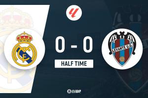 体育资讯1月17日讯 北京时间1月17日21:00,西甲第20轮皇马迎战莱万特的比赛在伯纳乌球场进行,上半场姆巴佩凌空抽射造险,皇马半场仅1射正,半场结束,皇马0-0莱万特。