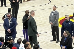 詹姆斯在比赛进行期间主动前往掘金替补席拥抱了约基奇。