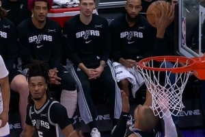 起飞了!凯莱布·乐福反击直接抛传 夏普蓄力起飞双手空接炸扣