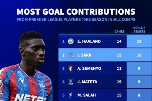 英超球员本赛季参与进球榜:哈兰德19球居首,萨尔10球次席