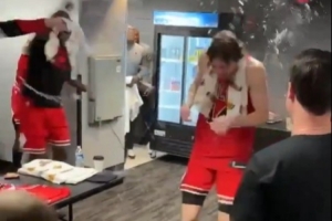 赛后,公牛队员在更衣室为布泽利斯泼水庆祝。
