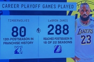 詹姆斯打过18次季后赛,共288场;森林狼队史13次季后赛,共80场