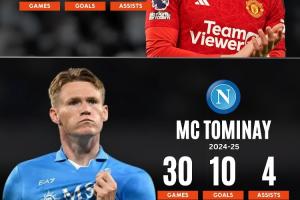 2024-25赛季,麦克托米奈效力那不勒斯,出战30场比赛,贡献10球4助。