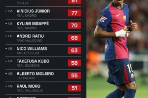 体育资讯4月26日讯 数据机构Squawka统计了西甲本赛季至今完成过人次数的排行榜,亚马尔131次完成过人断层领跑西甲!