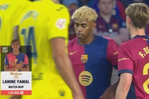 体育资讯5月19日讯 西甲第37轮,巴萨2-3不敌比利亚雷亚尔。本场比赛,巴萨边锋亚马尔首发出战,打进1球,赛后当选全场最佳球员。