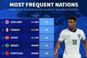 体育资讯2月18日讯 《转会市场》统计了当前身价前100球员的国籍情况,英法并列居首。