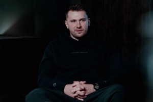 东契奇在这组花絮照中面带微笑,与两位节目主持人詹姆斯和纳什交谈着。