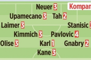 图片报拜仁赛后评分:卡尔1分、格纳布里和若纳坦·塔均2分