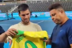 跨界交流大罗与阿尔卡拉斯打网球,并赠送签名球衣