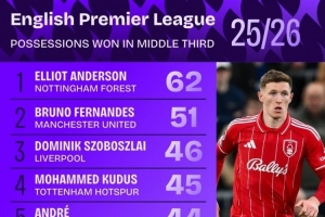 本赛季英超中场区域夺得球权榜:安德森居首,B费、索博前三