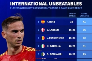 本世纪国家队生涯开局不败榜:法比安41场居首,巴雷拉31场第四