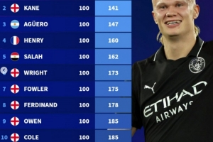 英超最快达成百球纪录榜:希勒124场居首,哈兰德目前107场98球